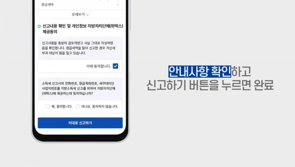 3. 신고 내용을 확인하고 ‘이대로 신고하기’ 버튼을 클릭하여 국세청 원클릭 환급 서비스를 완료합니다.