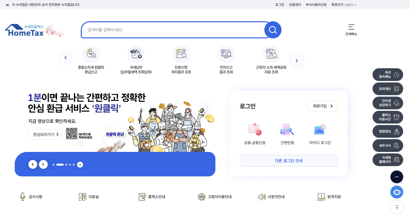 1. 국세청 원클릭 환급 서비스에 접속하기 위해 홈택스에 방문합니다.