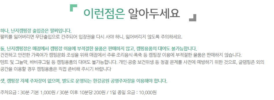 ✅ 난지캠핑장 예약 비수기(11~3월): 당일 예약 가능 (오후 5시 결제 마감).