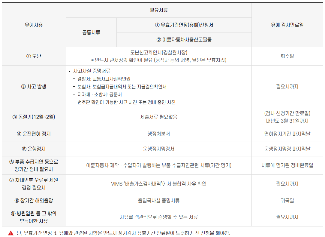 이륜차 정기검사 유예사유 및 필요서류